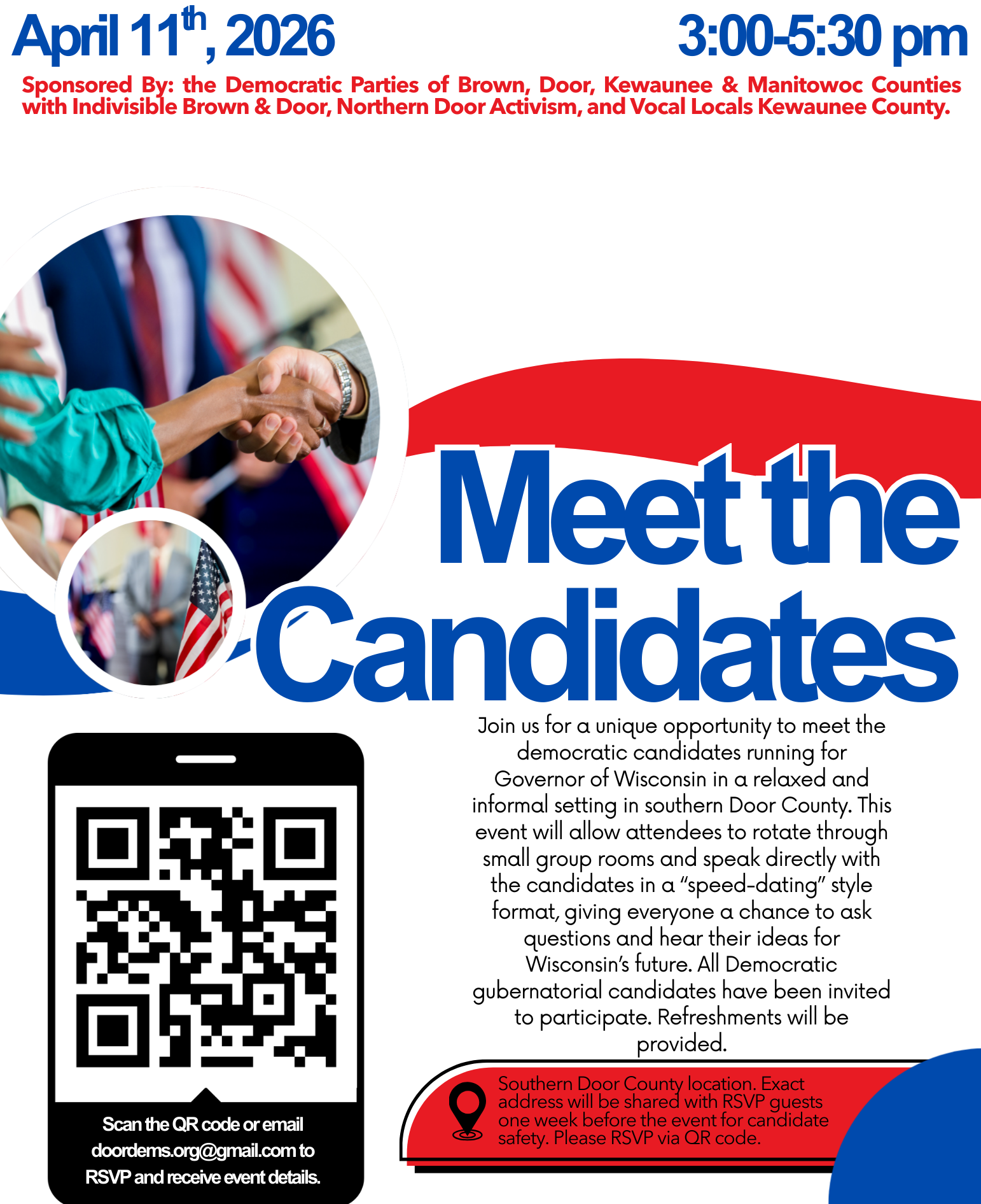 Location: Southern Door County. To receive the location and address please register for the event. To RSVP click here or send an email to doordems.org@gmail.com -